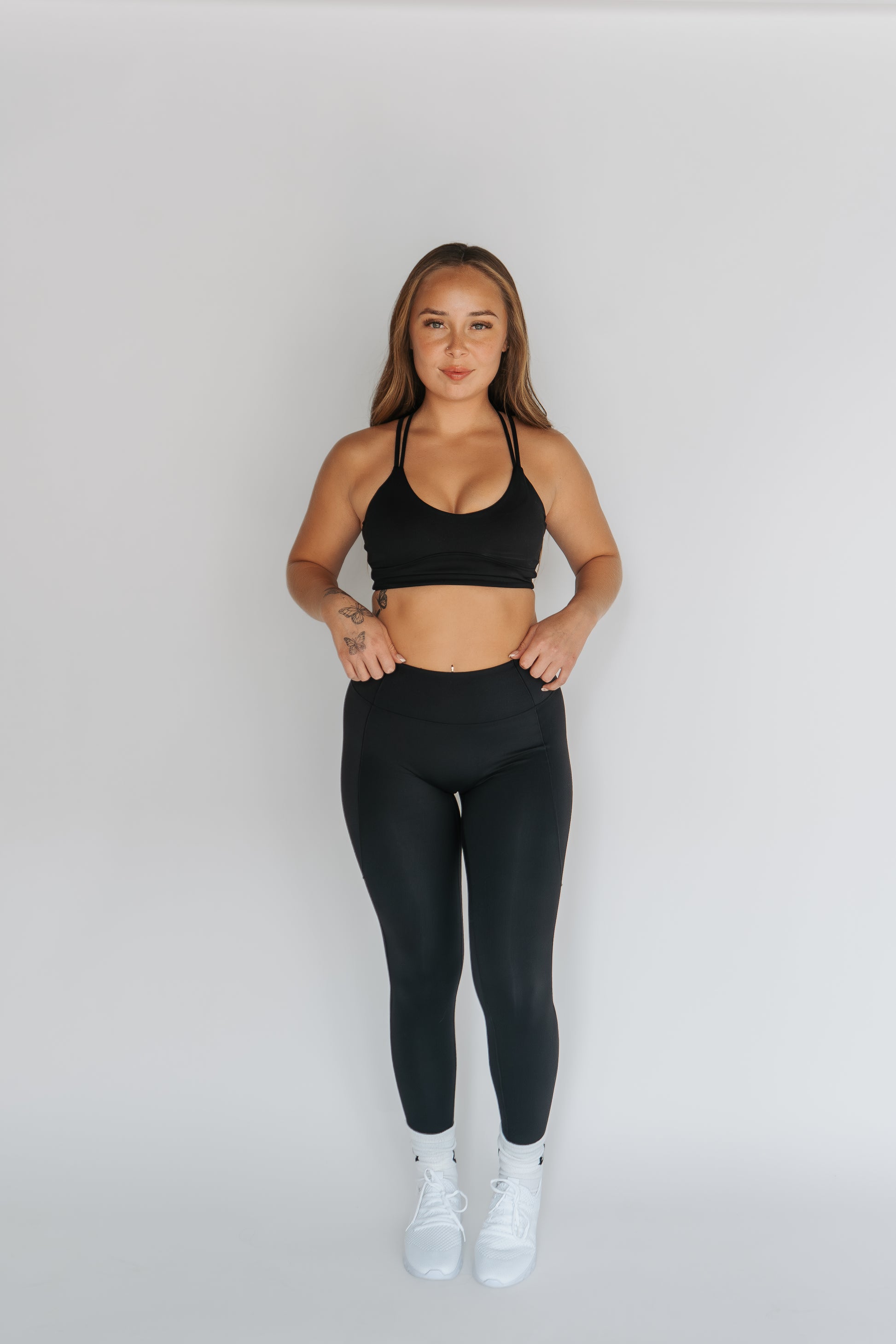 Supportive structured fabric for a secure, sculpted feel, this bra is made to shape and flatter. A subtle curved detail in front adds a refined finish, while double cross-back straps deliver both style and strength. Built to move with you—powerful in the studio, effortless beyond.