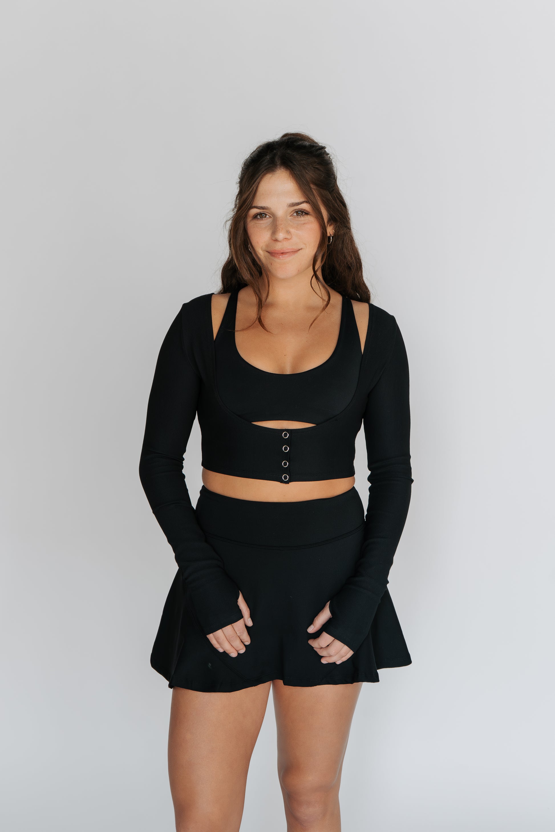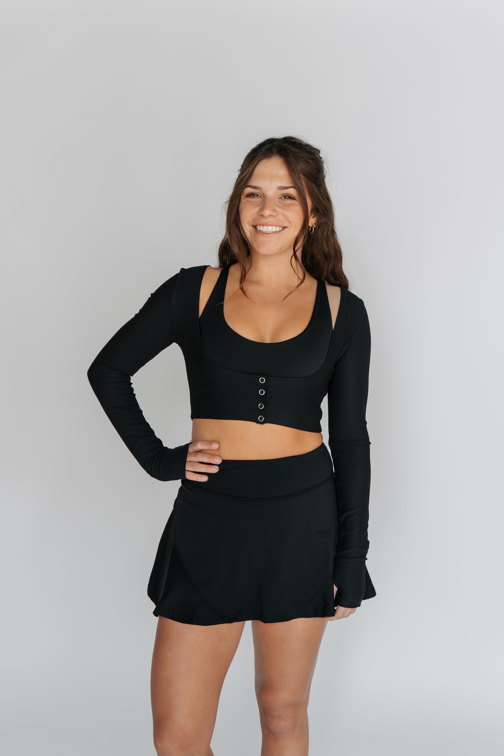 An elevated essential designed to layer and move. This long-sleeve crop features a ribbed texture and refined button details, blending casual ease with polished style. Perfect for throwing on after the studio, it transitions effortlessly into your next event with comfort and confidence.